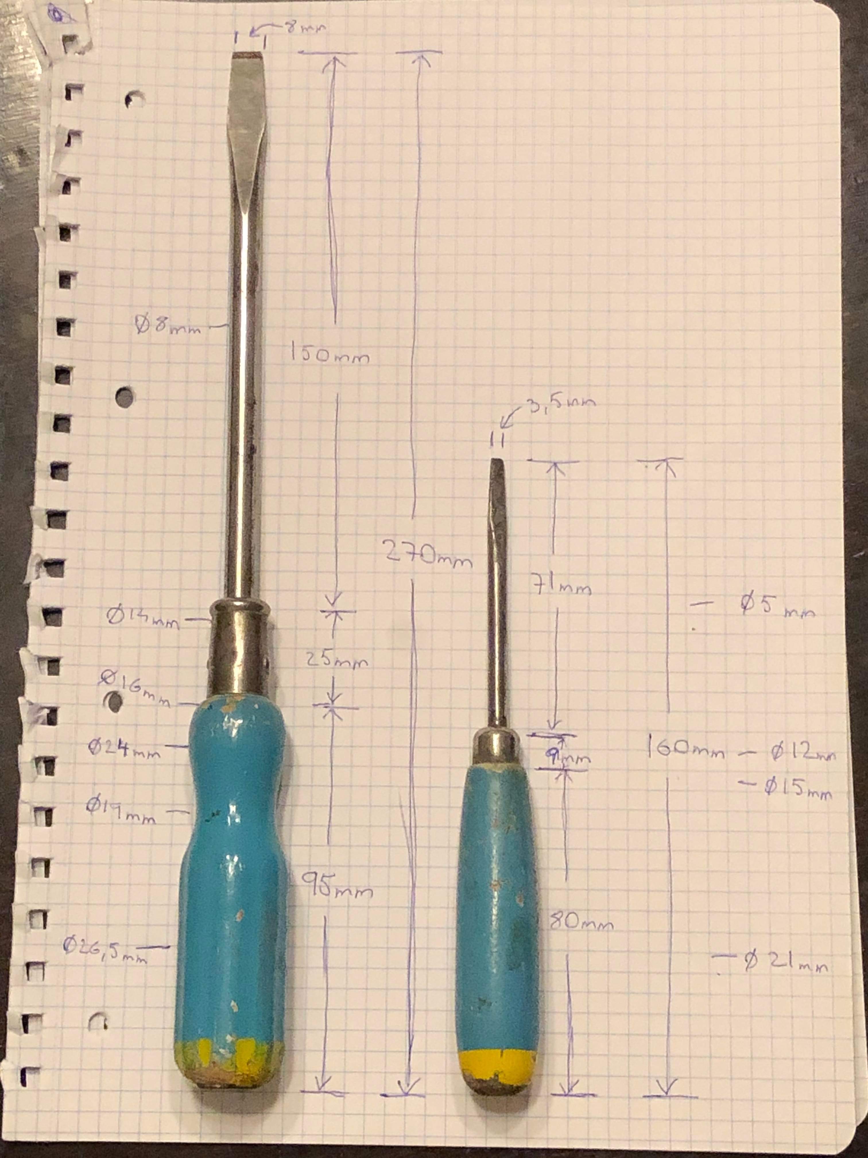 The wide mounting ring is 20mm. The 16" screwdrivers have no stamped text or markings,